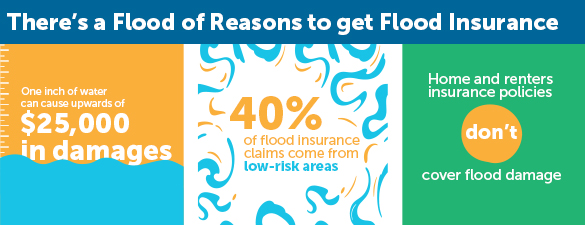 Las pólizas de seguro para propietarios de viviendas e inquilinos generalmente no cubren los daños por inundación. Debido a que las pólizas de seguro contra inundaciones tardan 30 días en entrar en vigor, es importante planificar con anticipación. Compre un seguro contra inundaciones ahora, para que su propiedad esté cubierta. Comunícate con un agente de seguros o visita FloodSmart.gov para analizar las opciones.