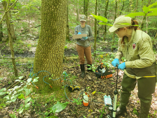 Katlin DeWitt, especialista en salud forestal del DOF, ha ayudado a administrar los tratamientos en los parques estatales y ha ayudado al personal del DCR. "Estamos muy comprometidos con la protección de estos árboles". Dijo DeWitt. "Nos gusta trabajar con otras agencias estatales y ayudar a salvar árboles en tierras estatales".