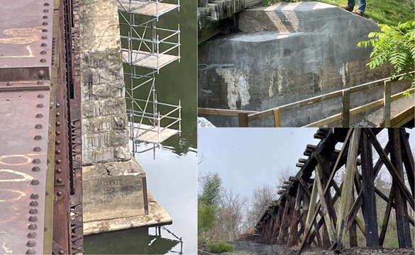 (Izquierda) Los muelles de caballete de mampostería de piedra en el caballete del río Ivanhoe. (Arriba a la derecha) Los estribos de caballete de hormigón en el Caballete Fries. (Abajo a la derecha) Reparaciones de madera pesada en Ivanhoe Trestle. Dependiendo del caballete, las reparaciones pesadas de madera pueden ser en los caballetes de soporte, en la estructura de la cubierta del caballete o en ambos.