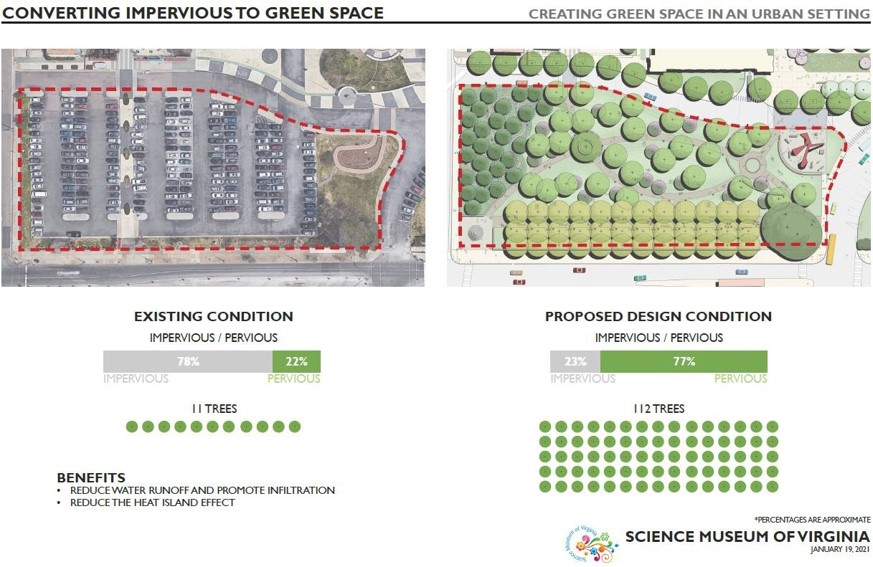 La Fundación Virginia Outdoors y el Museo de Ciencias de Virginia en Richmond propusieron una asociación innovadora que permitiría al Museo convertir un estacionamiento en la superficie de su histórica estación de Broad Street en un parque urbano.  La propuesta 5.2acres debían protegerse a perpetuidad como espacio abierto que proporcionara beneficios recreativos y ambientales. El proyecto incorporaría y demostraría soluciones naturales basadas en la ciencia a los efectos del cambio climático, al tiempo que abordaría la creciente necesidad de espacios verdes abiertos en un área bajo una intensa presión de desarrollo. La transferencia del control de la parcela a VOF bajo la Ley de Tierras de Espacios Abiertos la protegería a perpetuidad de la amenaza del desarrollo futuro y proporcionará el capital necesario para su transformación en un parque público de alta calidad y un paisaje sostenible. Este proyecto fue retirado.