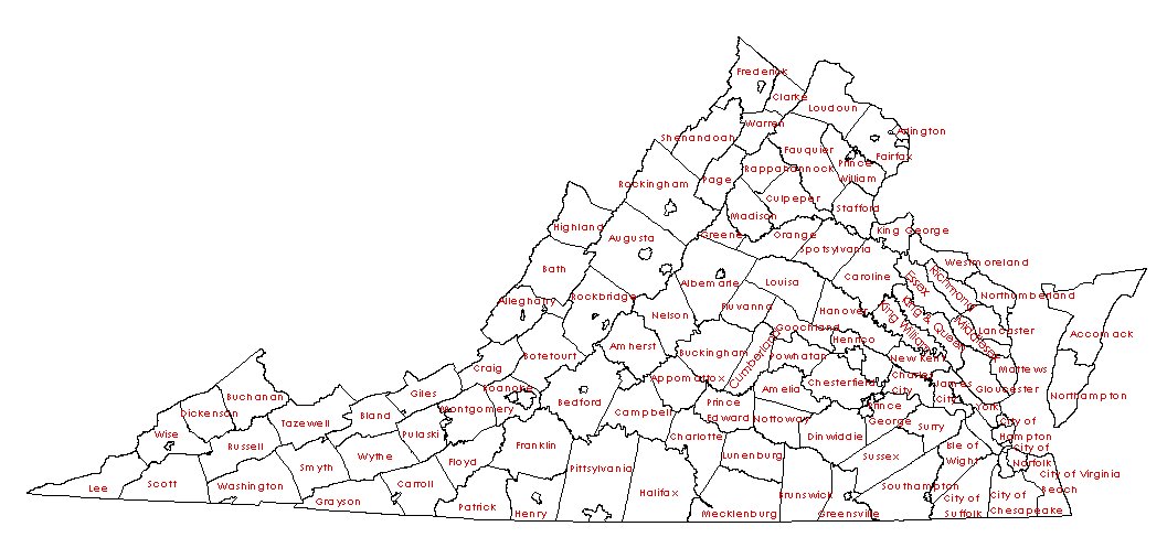 Los condados y las principales ciudades incorporadas de Virginia. Haga clic en el mapa de condados para abrir una imagen más grande en una ventana separada.