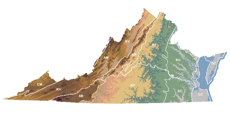 Para tratamientos de fisiografía y biogeografía de Virginia, así como un mapa que representa las principales divisiones provinciales del estado, consulte la sección Descripción general de la fisiografía y la vegetación de Virginia de este sitio web. Haga clic en el mapa de relieve fisiográfico a continuación para abrir una imagen más grande en una ventana separada.