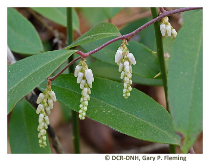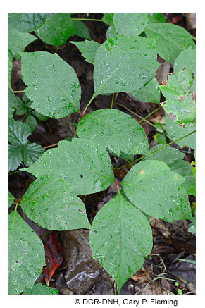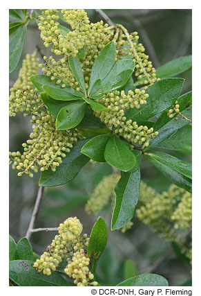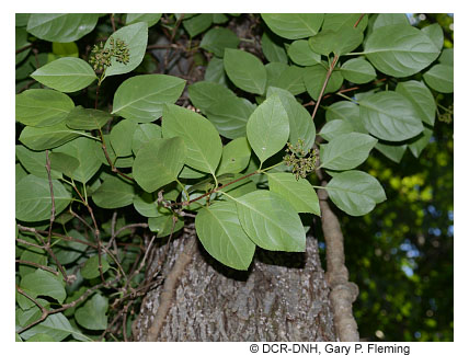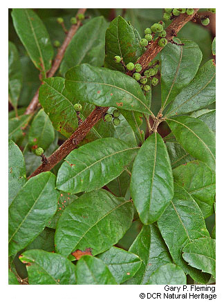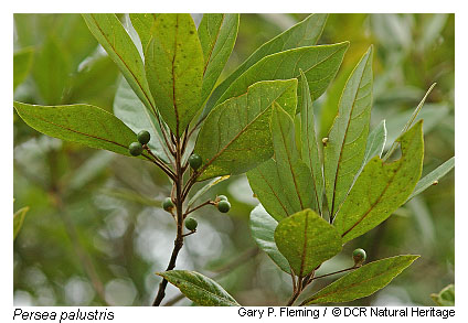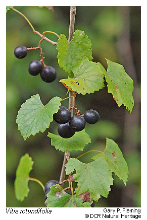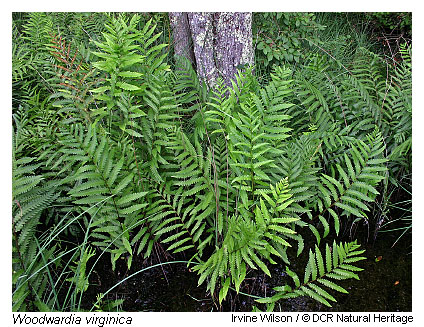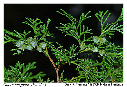Seasonally flooded non-riverine swamp forests that are somewhat similar to alluvial bald cypress - tupelo forests occur on poorly drained peatlands of the Coastal Plain. These communities are most abundant on terraces of the Embayed Region of extreme southeastern Virginia and northeastern North Carolina, but also occur in large, peat-filled hollows between ancient dunes behind Cape Henry in Virginia Beach. Habitats are non-riverine wetland flats with deep or shallow organic soils and seasonal flooding to depths of approximately 30 cm (12 in) by elevated water tables. Hummock-and-hollow microtopography is typical. Dominant trees are bald cypress (Taxodium distichum), swamp tupelo (Nyssa biflora), and red maple (Acer rubrum). Red maple now greatly dominates most stands because of extensive past logging, catastrophic fires, and ditching. Red bay (Persea palustris) and sweet pepperbush (Clethra alnifolia) are abundant in the lower woody layers. Also abundant are high-climbing vines of greenbriers (Smilax rotundifolia and Smilax laurifolia), poison ivy (Toxicodendron radicans var. radicans), climbing hydrangea (Hydrangea barbara), supplejack (Berchemia scandens), cross-vine (Bignonia capreolata), Virginia-creeper (Parthenocissus quinquefolia), and muscadine grape (Muscadinia rotundifolia var. rotundifolia). Netted chain fern (Lorinseria areolata) and Virginia chain fern (Anchistea virginica) are among the few herbs that occur regularly. The Tupelo - Bald Cypress Type of non-riverine swamp forest is the characteristic vegetation in and near the Great Dismal Swamp in Virginia. Its dense, vine-rich aspect gave the Swamp much of its historical reputation as a dark, mysterious, or dreadful place. Although most stands are now much altered, The Nature Conservancy has protected an impressive old-growth occurrence at Gum Swamp (City of Chesapeake) that contains bald cypress up to 1.75 m (5 ft 9 in) in diameter.