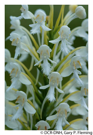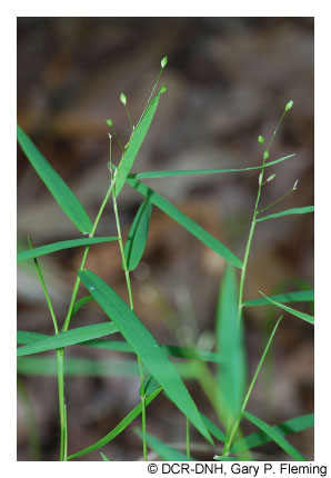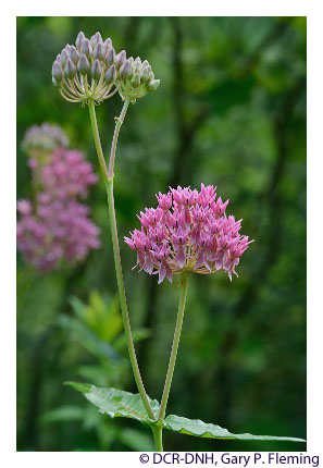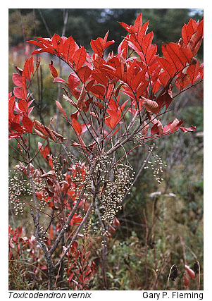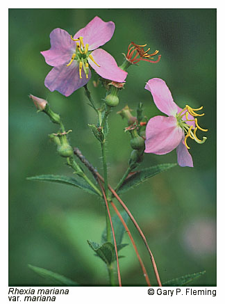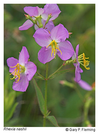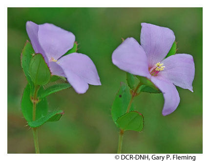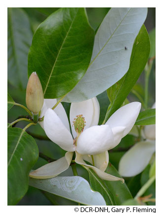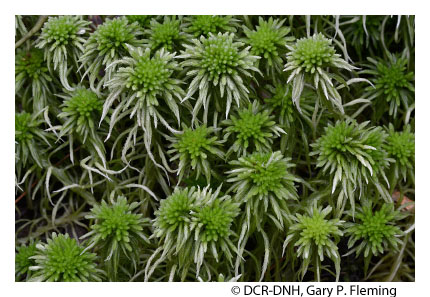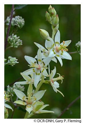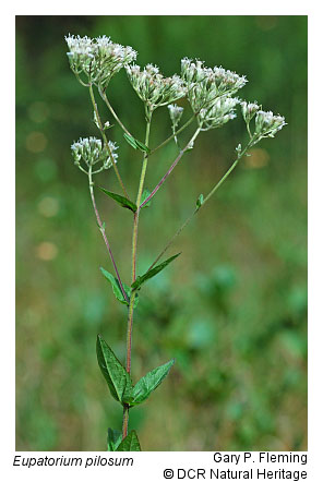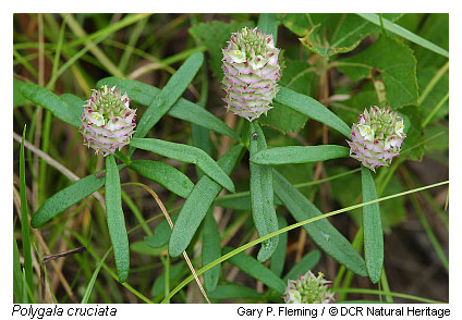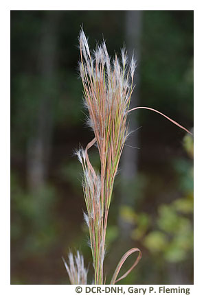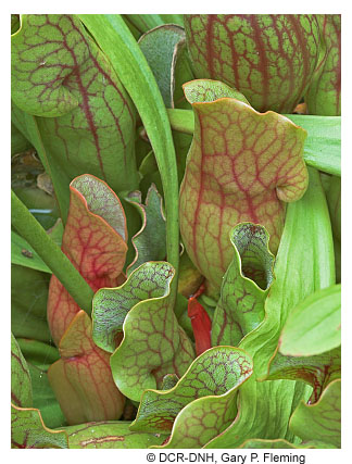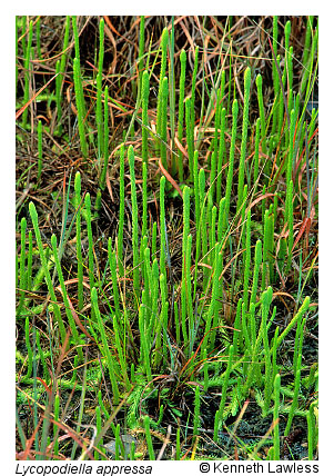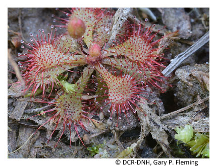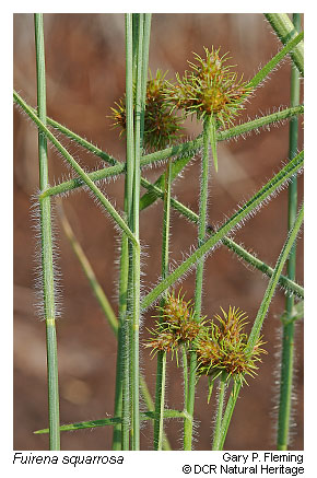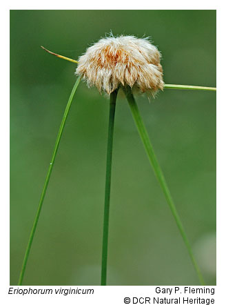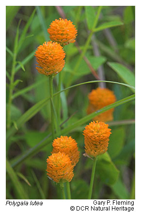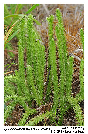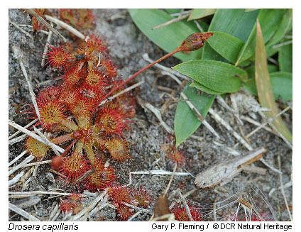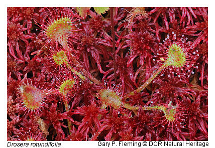 The vegetation of seepage bogs is usually a mosaic of scattered trees, shrub patches, and graminoid-dominated herbaceous patches. Typical woody species include sweetbay (Magnolia virginiana var. virginiana), poison sumac (Toxicodendron vernix), highbush blueberries (Vaccinium fuscatum, and Vaccinium formosum), possum-haw (Viburnum nudum), and smooth alder (Alnus serrulata). Among the most abundant herbaceous species, are twisted spikerush (Eleocharis tortilis), beakrushes (Rhynchospora spp.), narrow-leaved bluestem (Andropogon perangustatus), panic grasses (Dichanthelium dichotomum var. dichotomum and Dichanthelium lucidum), hairy umbrella-sedge (Fuirena squarrosa), meadow-beauties (Rhexia mariana var. mariana, Rhexia nashii, and Rhexia petiolata), clubmosses (Lycopodiella alopecuroides and Lycopodiella appressa), sundews (Drosera brevifolia, Drosera capillaris, and Drosera rotundifolia ), tawny cotton-grass (Eriophorum virginicum), bushy bluestem (Andropogon glomeratus), Nuttall's reed-grass (Calamagrostis coarctata), yellow-eyed-grasses (Xyris spp.), yellow milkwort (Polygala lutea), and vervain thoroughwort (Eupatorium pilosum). Other, less abundant, but nevertheless diagnostic, species of these bogs include red milkweed (Asclepias rubra), Rafinesque's seedbox (Ludwigia hirtella), large white fringed orchid (Platanthera blephariglottis), crossleaf milkwort (Polygala cruciata var. cruciata), purple pitcher-plant (Sarracenia purpurea ssp. venosa and ssp. purpurea), and large-flowered camas (Zigadenus glaberrimus). A large number of state-rare plants and several state-rare odonates (dragonflies and damselflies) are associated with seepage bogs.