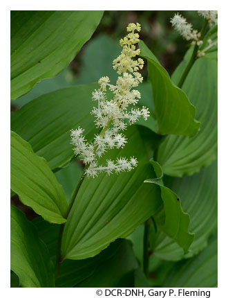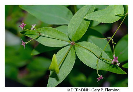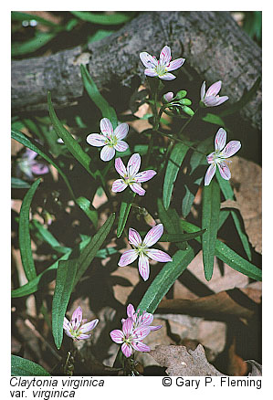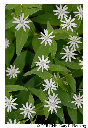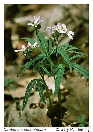 Overstory composition varies regionally, but is generally characterized by mixtures of white oak (Quercus alba), northern red oak (Quercus rubra), black oak (Quercus velutina), chestnut oak (Quercus montana), post oak (Quercus stellata), pignut hickory (Carya glabra), red hickory (Carya ovalis), shagbark hickory (Carya ovata), mockernut hickory (Carya tomentosa), white ash (Fraxinus americana), and tulip-tree (Liriodendron tulipifera). Hickories are especially abundant in these forests and may dominate some stands. Dominance by tulip-tree usually follows heavy logging or other catastrophic disturbances. Eastern redbud (Cercis canadensis var. canadensis), eastern hop-hornbeam (Ostrya virginiana), and flowering dogwood (Cornus florida) are common understory species. Herb layers are typically patchy but species-rich and support diverse mixtures of both mesophytic and dry-site species. In the spring, small geophytes such as cut-leaf toothwort (Cardamine concatenata), rue-anemone (Thalictrum thalictroides), star chickweed (Stellaria pubera), and spring beauty (Claytonia virginica var. virginica) frequently carpet the ground layers of these oak-hickory forests. The summer and fall aspect is dominated by forbs and grasses such as woodland agrimony (Agrimonia rostellata), four-leaf milkweed (Asclepias quadrifolia), curlyheads (Clematis ochroleuca), Bosc's panic grass (Dichanthelium boscii), naked-flowered tick-trefoil (Hylodesmum nudiflorum), bottlebrush grass (Elymus hystrix), bedstraws (particularly Galium circaezans and Galium latifolium), eastern solomon's-plume (Maianthemum racemosum ssp. racemosum), rock muhly (Muhlenbergia sobolifera), goldenrods (particularly Solidago caesia var. caesia and Solidago ulmifolia), yellow pimpernel (Taenidia integerrima), lesser horse-gentian (Triosteum angustifolium), and wood violet (Viola palmata var. triloba).