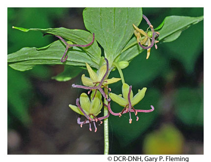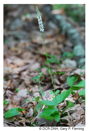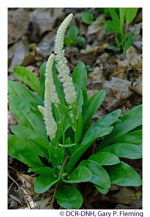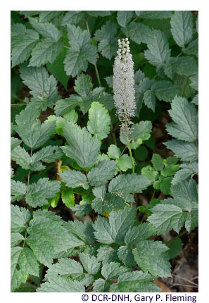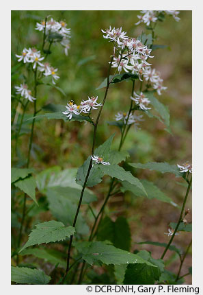 Montane mixed oak forests cover extensive areas in western Virginia and generally occupy intermediate positions along major environmental gradients such as soil moisture, soil fertility, and elevation. Soils occupied by montane mixed oak forests are typically less fertile than those of the true montane oak-hickory forests. Overstory composition contains mixtures of chestnut oak (Quercus montana), northern red oak (Quercus rubra), and white oak (Quercus alba). Overstory associates vary with geography and site conditions, but often include sweet birch (Betula lenta var. lenta), magnolias (Magnolia acuminata and Magnolia fraseri), sourwood (Oxydendrum arboreum), hickories (Carya spp.), red maple (Acer rubrum), tulip-tree (Liriodendron tulipifera), and white pine (Pinus strobus). The understories of mixed oak communities usually contain a substantial component of heaths, but also contain many non-ericaceous species such as witch hazel (Hamamelis virginiana var. virginiana), striped maple (Acer pensylvanicum), maple-leaved viburnum (Viburnum acerifolium), mountain holly (Ilex montana), buffalo-nut (Pyrularia pubera), and hazelnuts (Corylus cornuta var. cornuta and Corylus americana). The herbaceous component is relatively diverse, but often patchy and composed of both acidophiles and species characteristic of moderately fertile soils, including New York fern (Parathelypteris noveboracensis), galax (Galax urceolata), Curtis' goldenrod (Solidago curtisii), white wood aster (Eurybia divaricata), indian cucumber-root (Medeola virginiana), squawroot (Conopholis americana), halberd-leaved yellow violet (Viola hastata), speckled wood lily (Clintonia umbellulata), devil's-bit (Chamaelirium luteum), mountain golden-alexanders (Zizia trifoliata), and American lily-of-the-valley (Convallaria pseudomajalis).