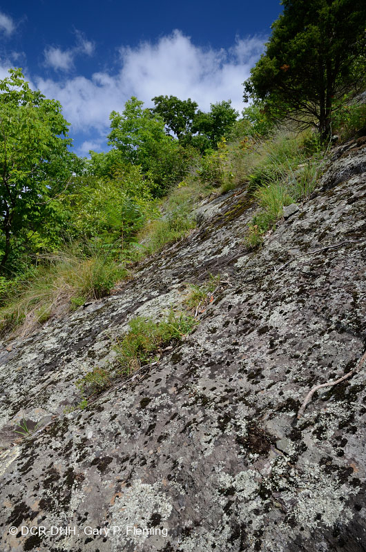 Pavimento de metabasalto precipitado con parches dispersos de cedro rojo del este (Juniperus virginiana),Chionanthus virginicus y Schizachyrium scoparium var. scoparium. Flanco occidental del Blue Ridge cerca de Laurel Springs Gap, condado de Augusta. Distrito de Glenwood-Pedlar, Bosques Nacionales George Washington & Jefferson. © DCR-DNH, Gary P. Fleming