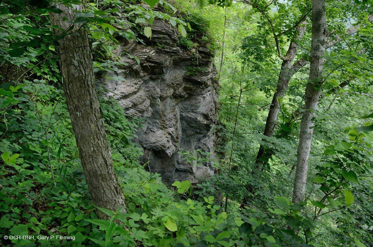 Bosque calcáreo seco-mésico dominado por arce azucarero (Acer saccharum) y robles, en una ladera empinada y rocosa con numerosos afloramientos de dolostona sobre el río Clinch en el condado de Russell. Reserva del Área Natural Estatal Pinnacle. © DCR-DNH, Gary P. Fleming