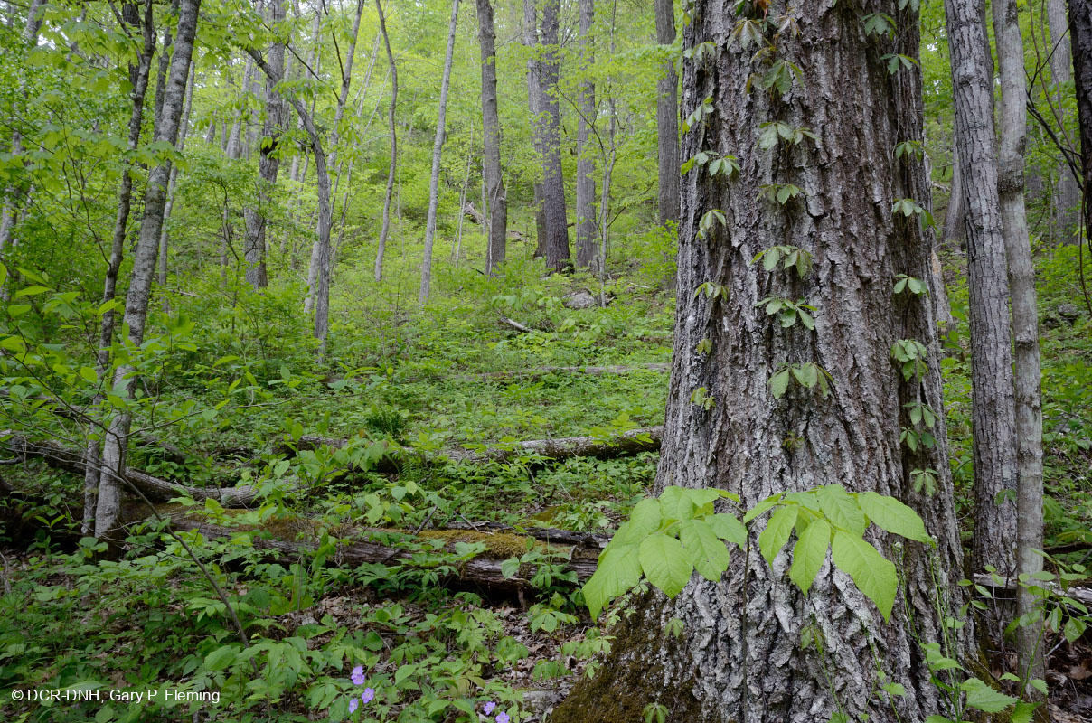 Un bosque calcáreo seco-mésico dominado por roble rojo del norte (Quercus rubra) y nogales (Carya spp.), con un sotobosque de arces de azúcar más jóvenes (Acer saccharum), en una ladera de piedra caliza a lo largo del río Jackson en el condado de Bath. La capa de la hierba está bien desarrollada con generalistas mesófitos. Distrito de guardabosques de Warm Springs, Bosques Nacionales George Washington y Jefferson. © DCR-DNH, Gary P. Fleming