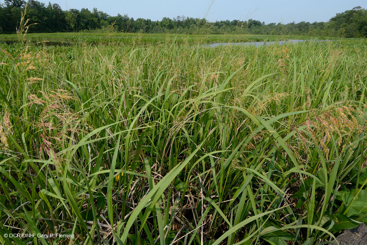 Denso rodal de arroz silvestre del sur (Zizaniopsis miliacea) a mediados de junio, a lo largo de la marea fresca del arroyo Ashton en el condado de Chesterfield. Parque Punta de las Rocas. © DCR-DNH, Gary P. Fleming