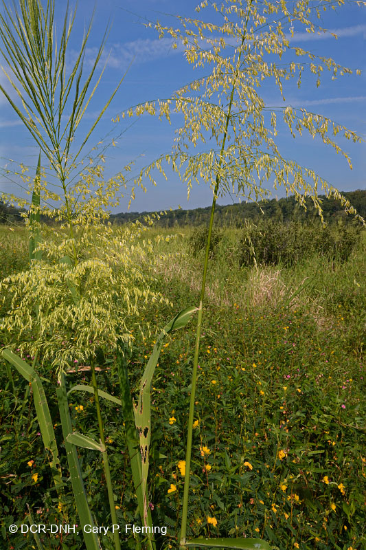 Wild rice (Zizania aquatica var. aquatica) is a diagnostic, and often abundant species of tidal freshwater marshes. Unlike the early summer-blooming, perennial southern wild rice, it is a fast-growing annual that reaches maximum height and cover late in the growing season. Ashton Creek, Chesterfield County, Point of Rocks Park. © DCR-DNH, Gary P. Fleming
