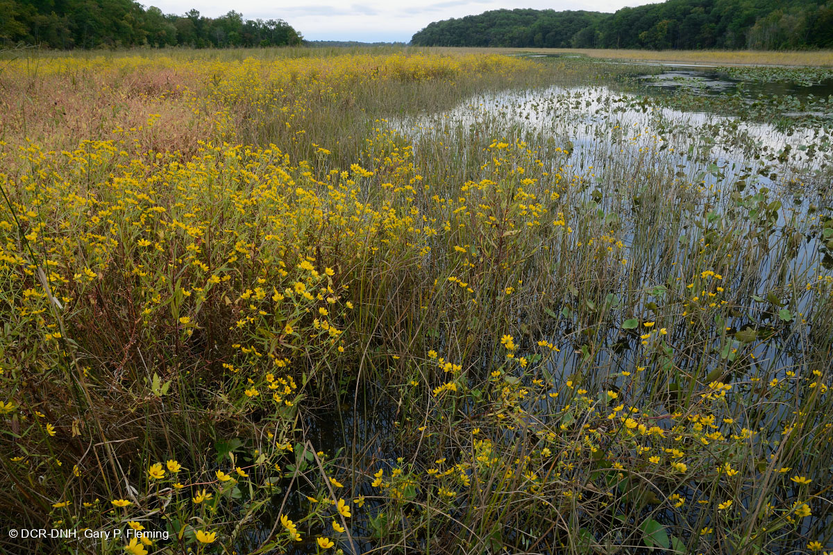A finales del verano y principios del otoño, la marisma alta mixta a lo largo de Accokeek Creek en el condado de Stafford está dominada por compuestos llamativos, principalmente caléndula lisa (Bidens laevis) y caléndula de pantano alta (Bidens trichosperma). Reserva del Área Natural Estatal Nido de Cuervos. © DCR-DNH, Gary P. Fleming