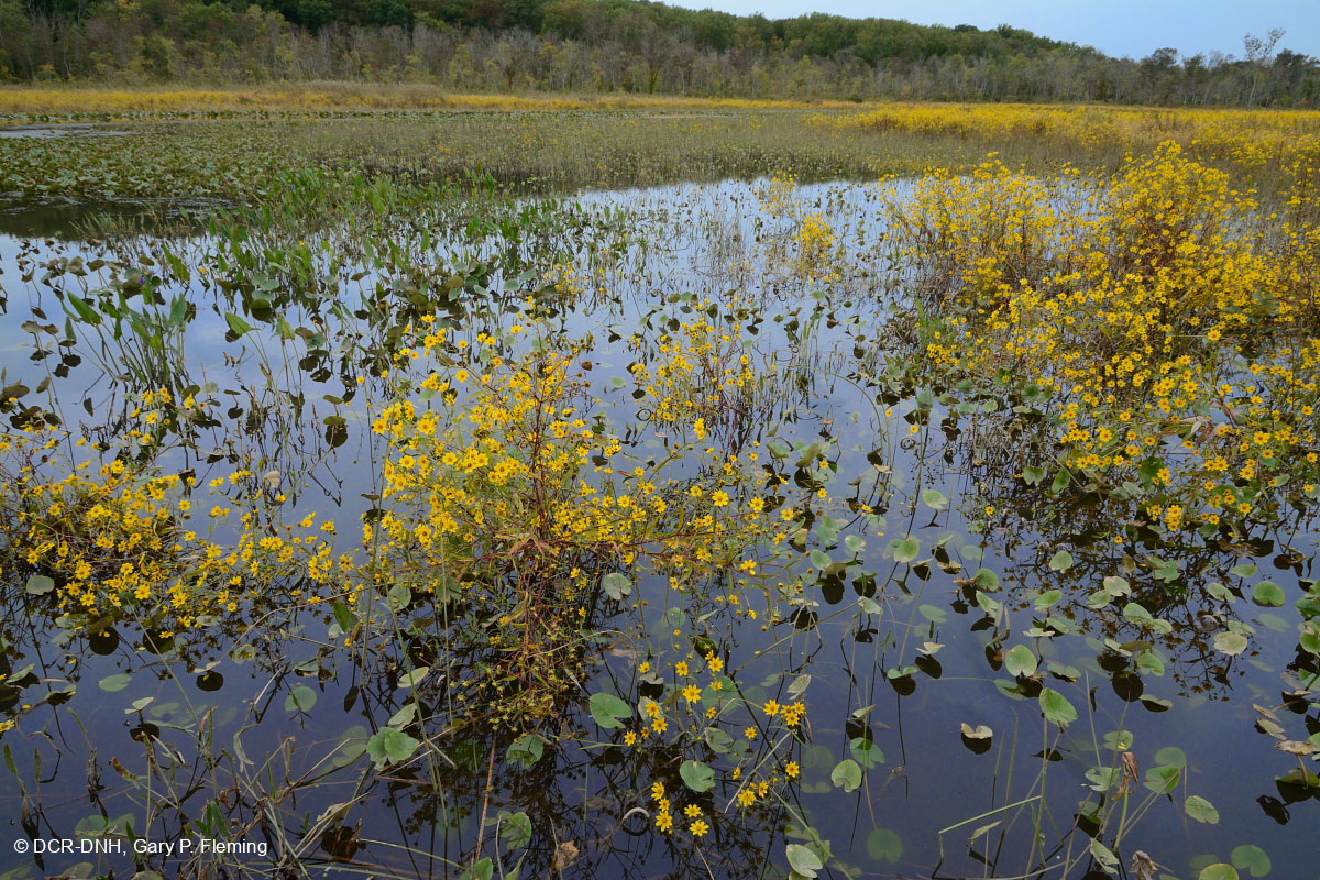 Marea alta a principios del otoño a lo largo de Accokeek Creek en el condado de Stafford, con caléndula alta (Bidens laevis) mezclada con salpicaduras comunes (Nuphar advena) y hierba de pepinillo (Pontederia cordata var. cordata). Reserva del Área Natural Estatal Nido de Cuervos. © DCR-DNH, Gary P. Fleming