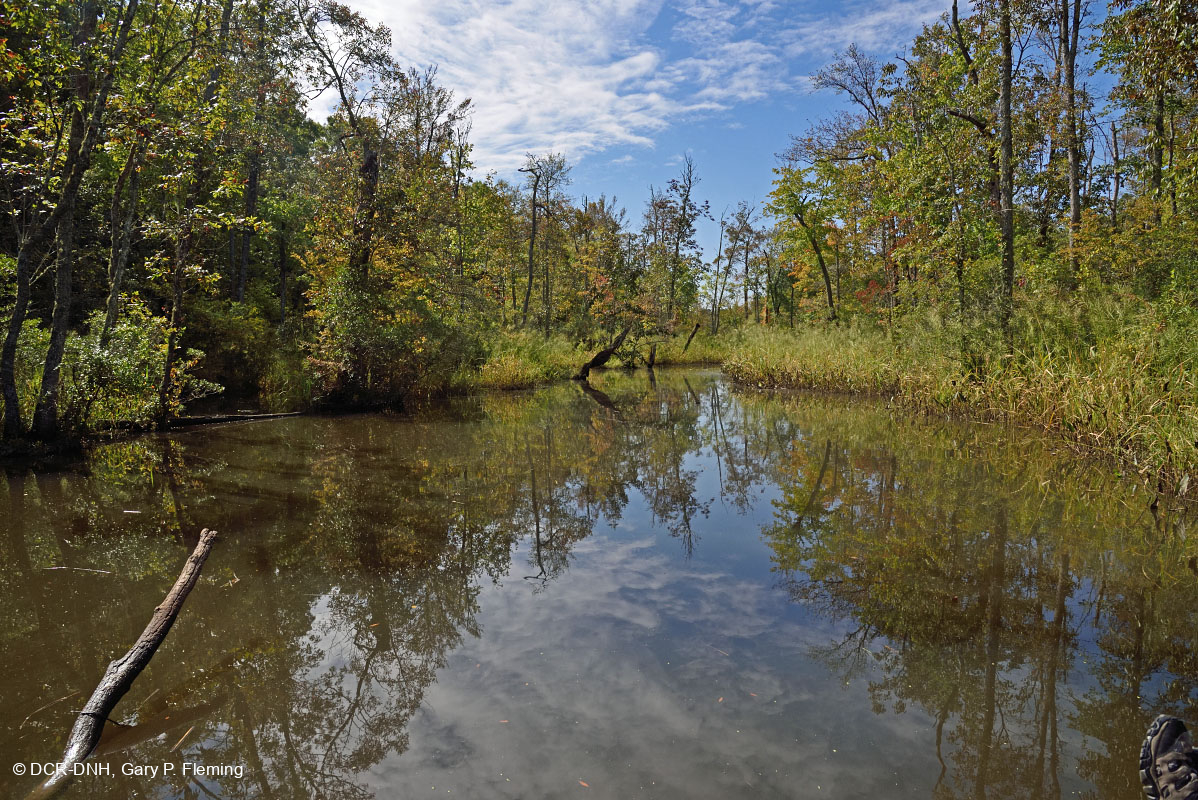 Pantano de madera dura de marea dulce a lo largo del pantano France, sobre su confluencia con Ware Creek, al sureste de Barhamsville en el condado de James City. El patógeno insecto introducido, el barrenador esmeralda del fresno (Agrilus planipennis), está matando a muchos fresnos y causando grandes brechas en el dosel de este rodal. © DCR-DNH, Gary P. Fleming