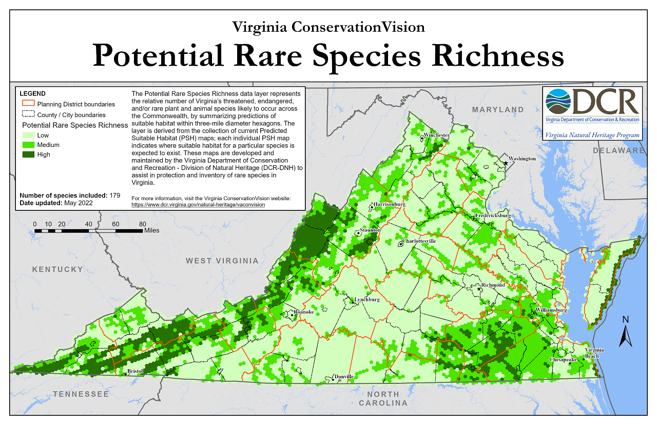Departamento de Conservación y Recreación (DCR) El Departamento de Conservación y Recreación de Virginia - División de Patrimonio Natural (DCR-DNH), está utilizando el modelado de hábitat de especies (SHM) para desarrollar mapas de Hábitat Adecuado Previsto (PSH) para especies raras de plantas y animales. Estos productos ofrecen una herramienta consistente, desarrollada a partir de métodos transparentes y repetibles, para su uso a nivel local, estatal y regional, para una miríada de propósitos de conservación y planificación. A partir de 2020, hemos completado productos SHM y PSH para más de 179 especies raras, incluidas todas las especies amenazadas y en peligro de extinción (T & E) federales y / o estatales enumeradas en Virginia antes de la primavera de 2018. Además, la capa Resumen de Hábitat Adecuado Pronosticado (PSHS, por sus siglas en inglés) combina PSH específicos de cada especie en una sola capa, lo que identifica de manera eficiente las áreas de mayor conflicto/preocupación posible con hábitats de especies raras. Algunas versiones del PSHS se pueden compartir sin revelar datos confidenciales (Mapa 1). En el cuadro que figura a continuación se presenta un resumen de los productos SHM disponibles en la División del Patrimonio Natural.
