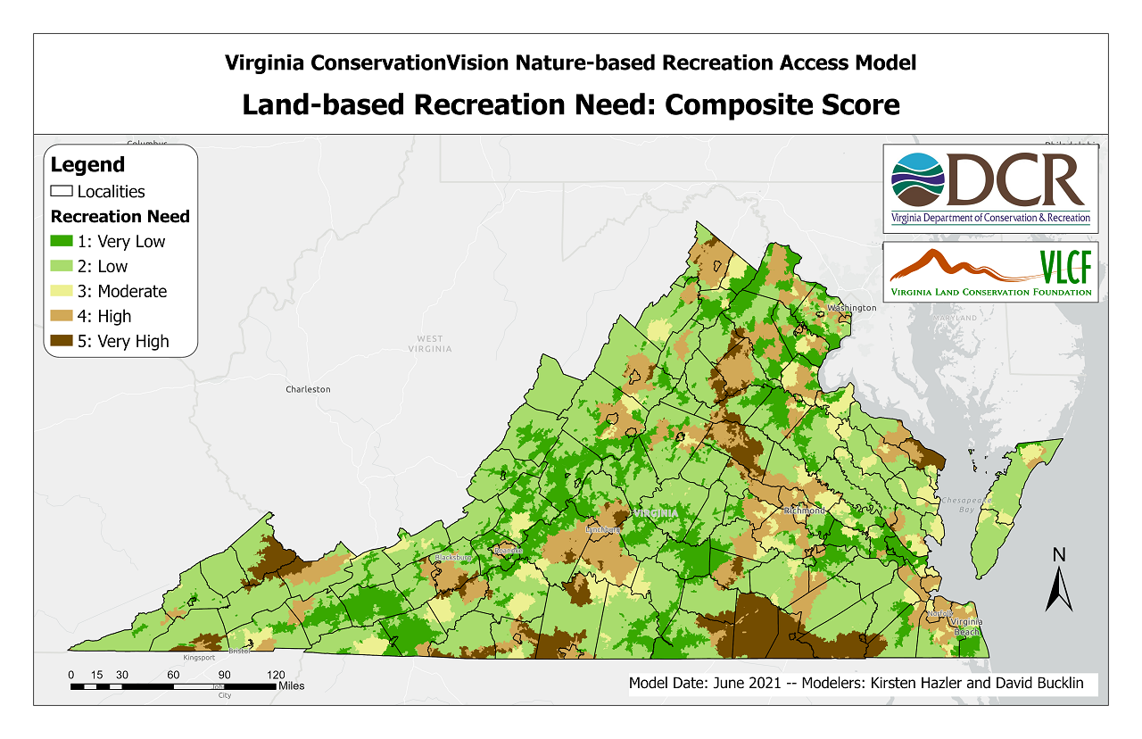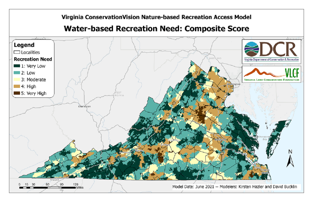Las métricas del modelo se puntuaron, ponderaron y combinaron para calcular medidas compuestas de las necesidades de recreación terrestres y acuáticas. El modelo es una contribución al atlas digital de planificación de la conservación conocido como Virginia ConservationVision. Está destinado a ayudar a los planificadores de tierras que priorizan las tierras para la conservación y el acceso a la recreación, y es utilizado por organizaciones de subvenciones como la Fundación de Conservación de Tierras de Virginia para ayudar a asignar fondos para varios proyectos de conservación y recreación. También está destinado a ser utilizado junto con ConserveVirginia, la estrategia oficial de conservación de tierras de Virginia.