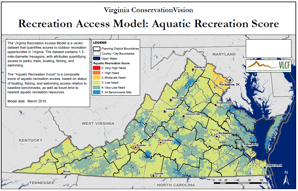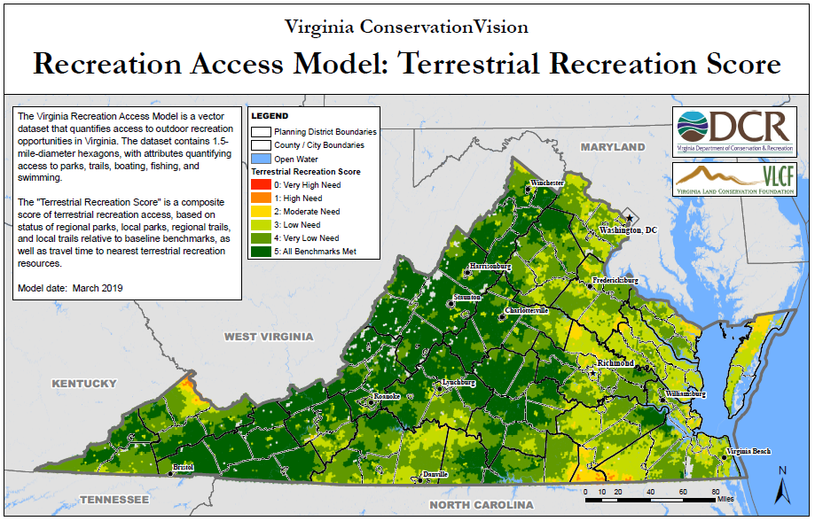 El modelo de acceso a la recreación de Virginia es un conjunto de datos vectoriales que cuantifica el acceso a las oportunidades de recreación al aire libre en Virginia. El conjunto de datos contiene 1.5hexágonos de una milla de diámetro, con atributos que cuantifican el acceso a parques, senderos, paseos en bote, pesca y natación. El término "parque" se usa vagamente para referirse a cualquier bloque de tierra contiguo con acceso público para la recreación. "Natación" se refiere a las oportunidades de nadar fuera de la piscina, la playa o la orilla.