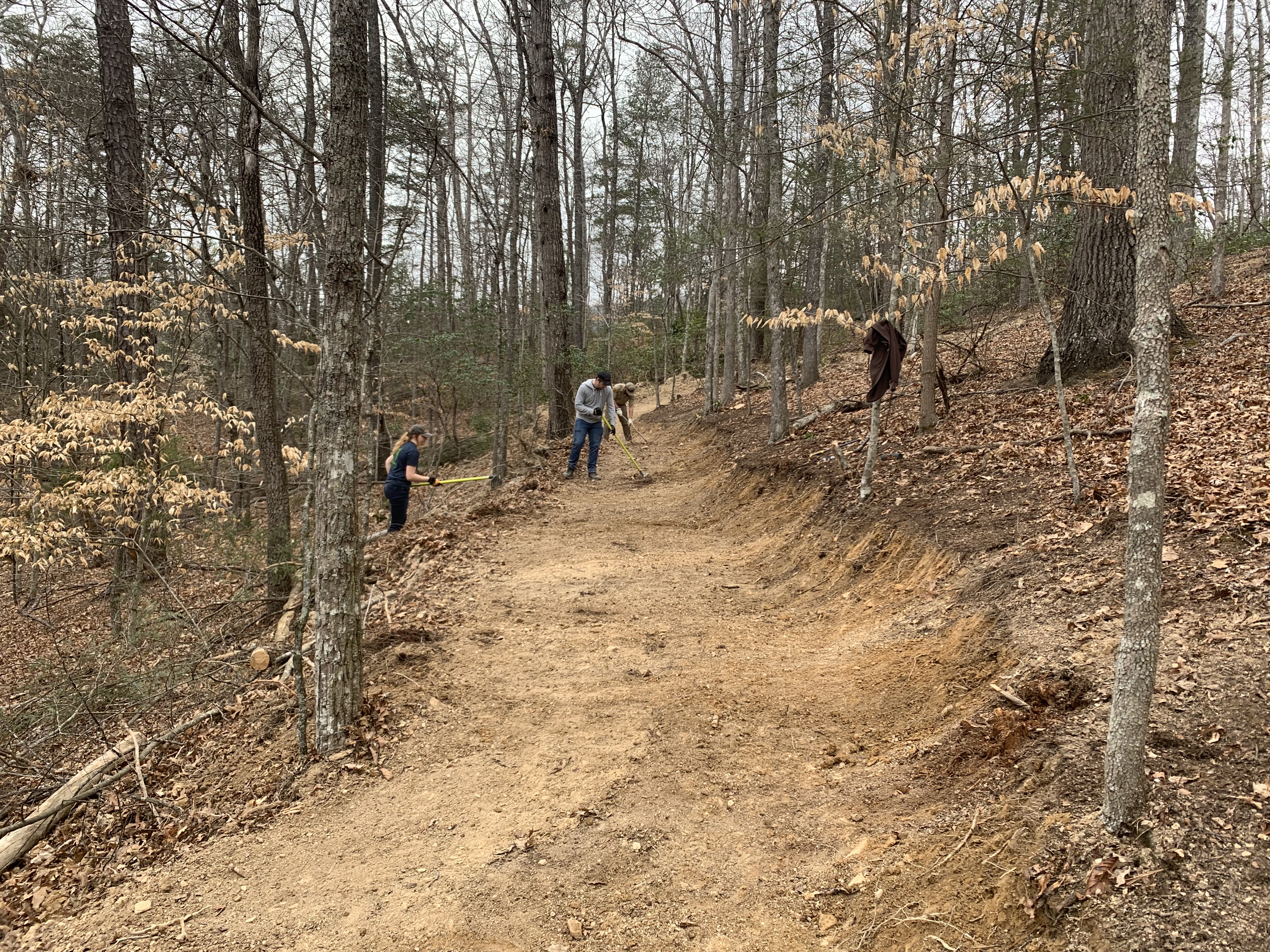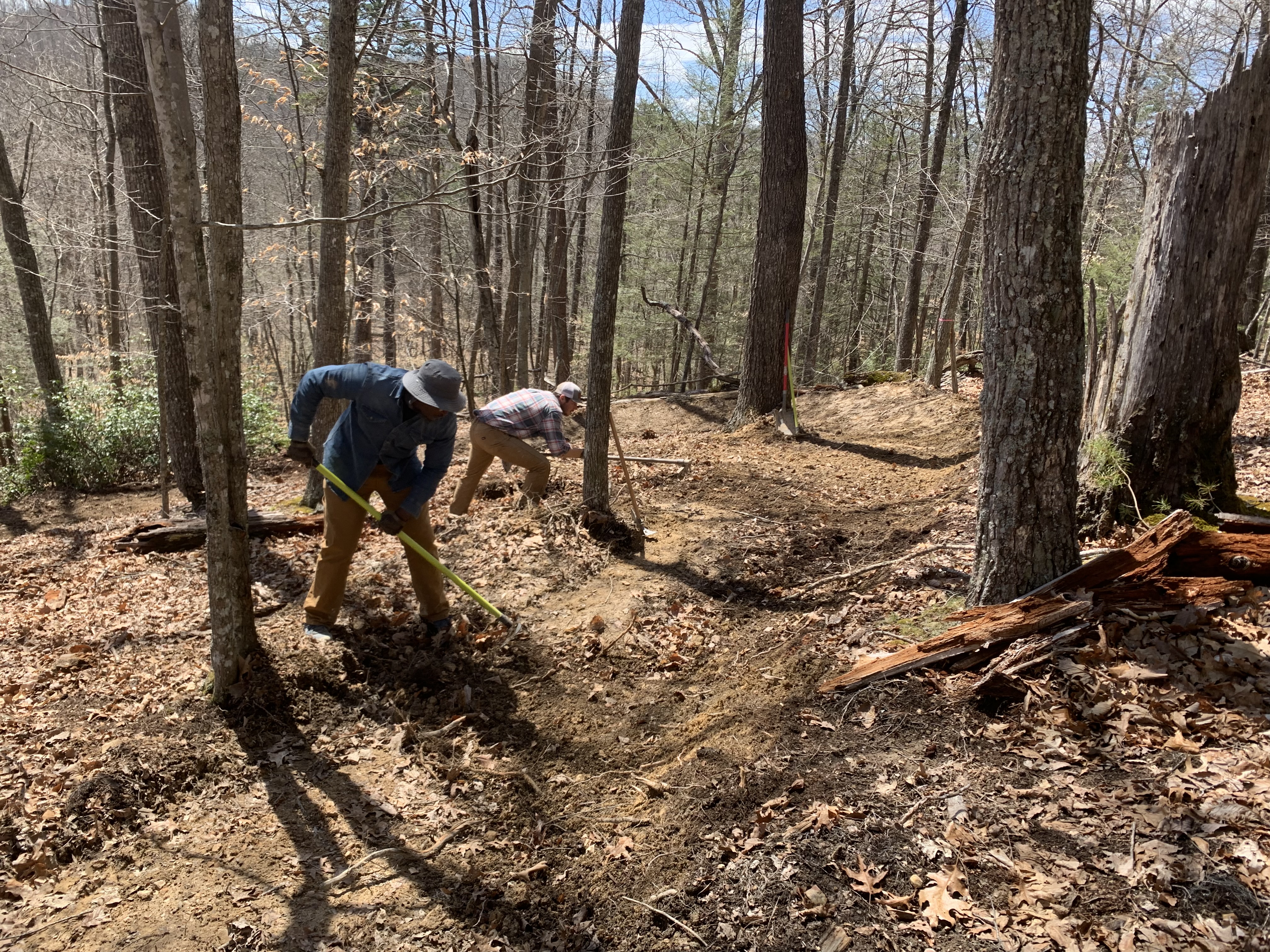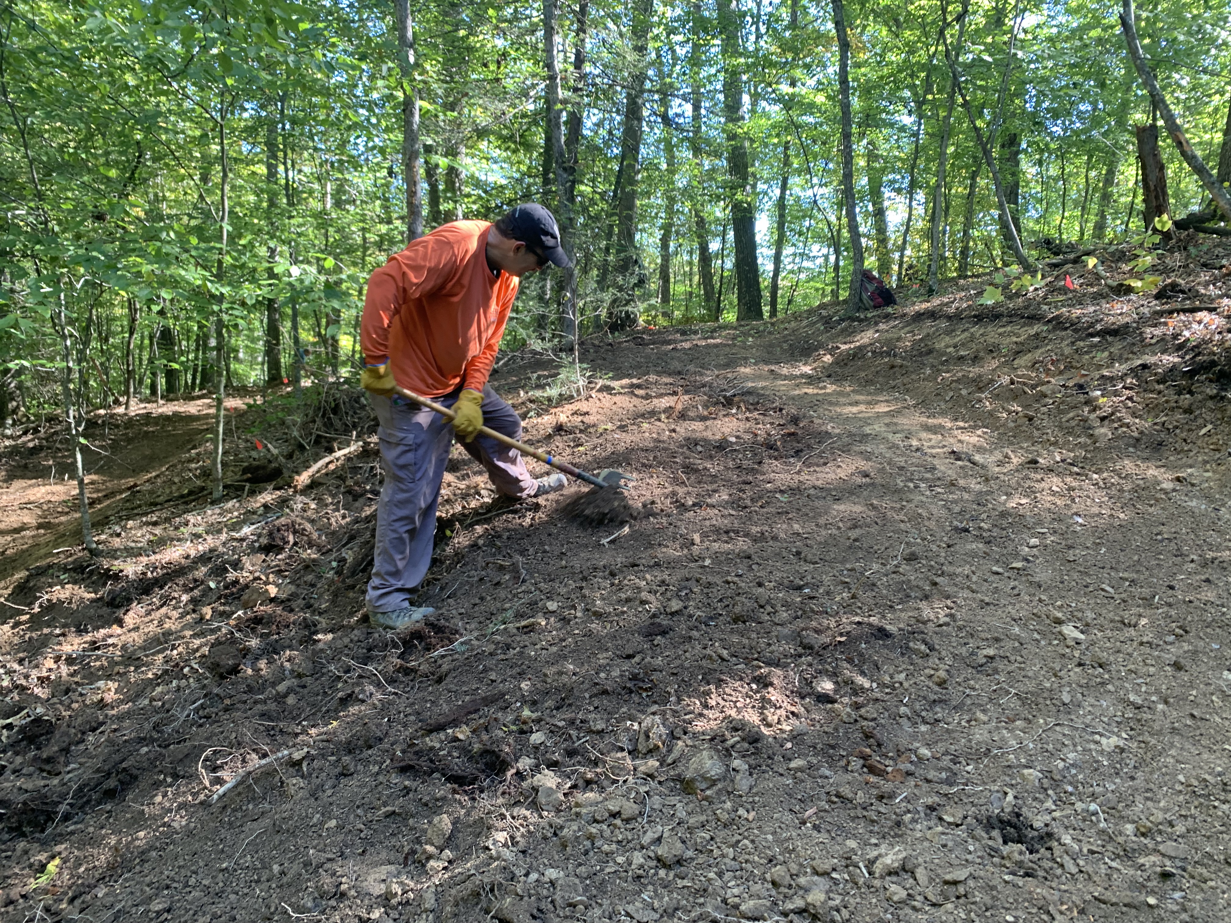 La construcción del sistema de senderos para bicicletas de montaña Raider’s Run está siendo dirigida por el equipo de recursos del distrito de Parques Estatales de Virginia. El progreso no sería posible sin el apoyo de los voluntarios, incluida la Sociedad Americana de Senderismo y los grupos alternativos de vacaciones de primavera.