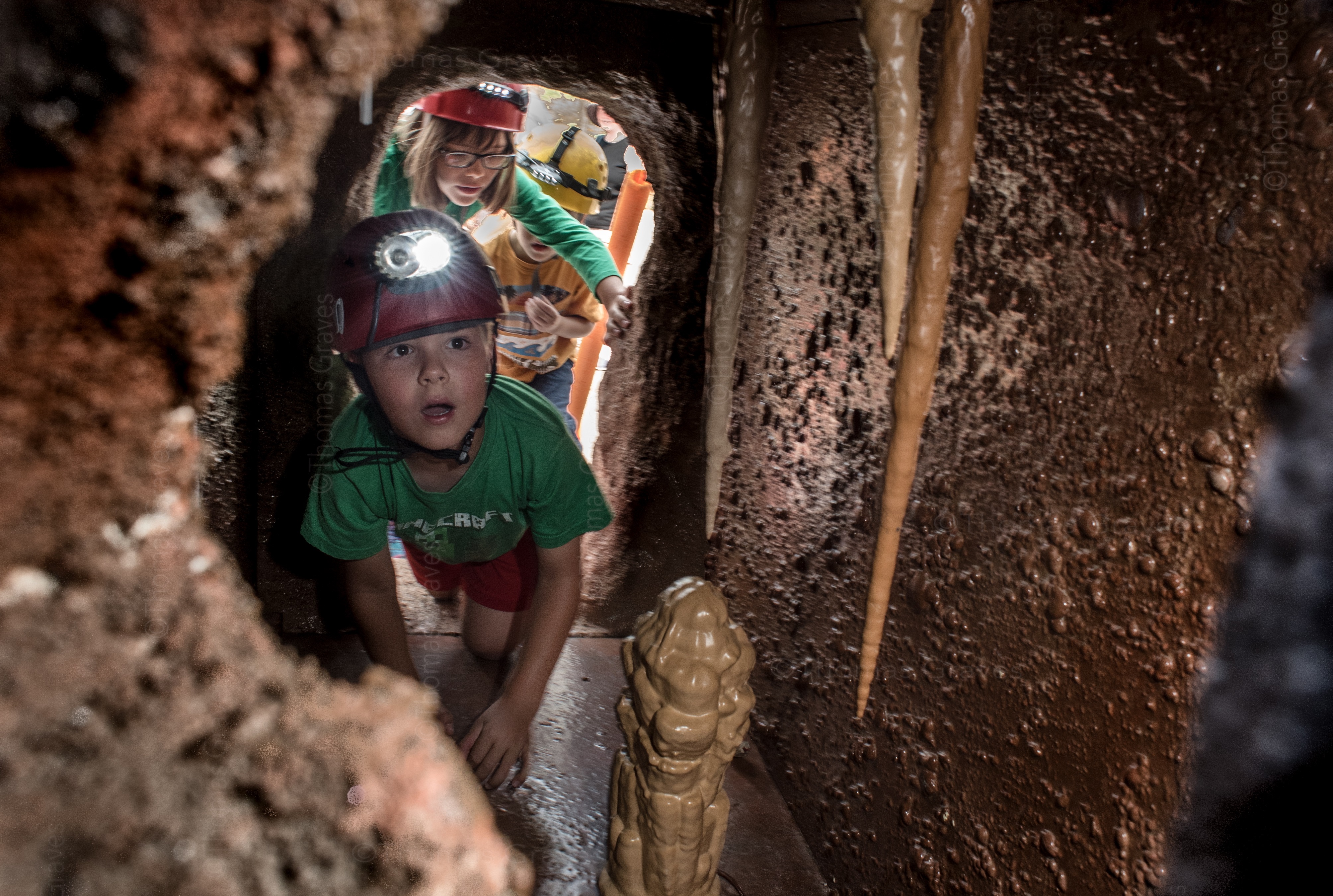 De 9 a.m. a 5 p.m., los visitantes pueden poner a prueba sus habilidades de explorador con CaveSim, un sistema de cuevas móvil. Después de arrastrarse a través del pasaje de la cueva artificial de 130pies, los visitantes pueden escalar una torre de espeleología vertical de 12pies o probar suerte en un espacio reducido con la caja de presión. Esta experiencia interactiva enseña a los participantes sobre prácticas seguras de espeleología, geología y ecosistemas de cuevas.