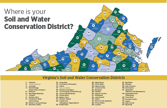 Los mapas descargables de los Distritos de Conservación de Suelos y Aguas de Virginia tienen el tamaño de afiches y membretes estándar.