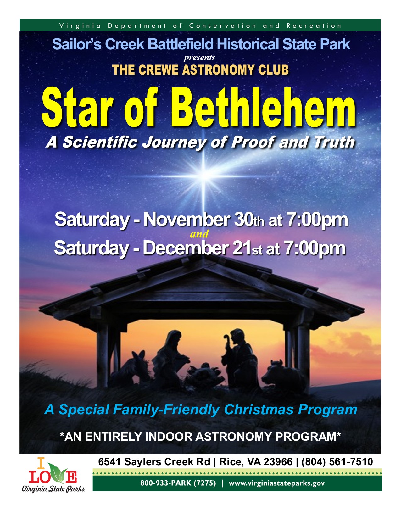 Un viaje espiritual y divertido para añadir a las vacaciones de Navidad para toda tu familia. Este programa familiar es gratuito para el público e incluirá una sesión de preguntas y respuestas inmediatamente después de su conclusión. Si tiene preguntas, llame al Centro de Visitantes al (804) 561-7510.