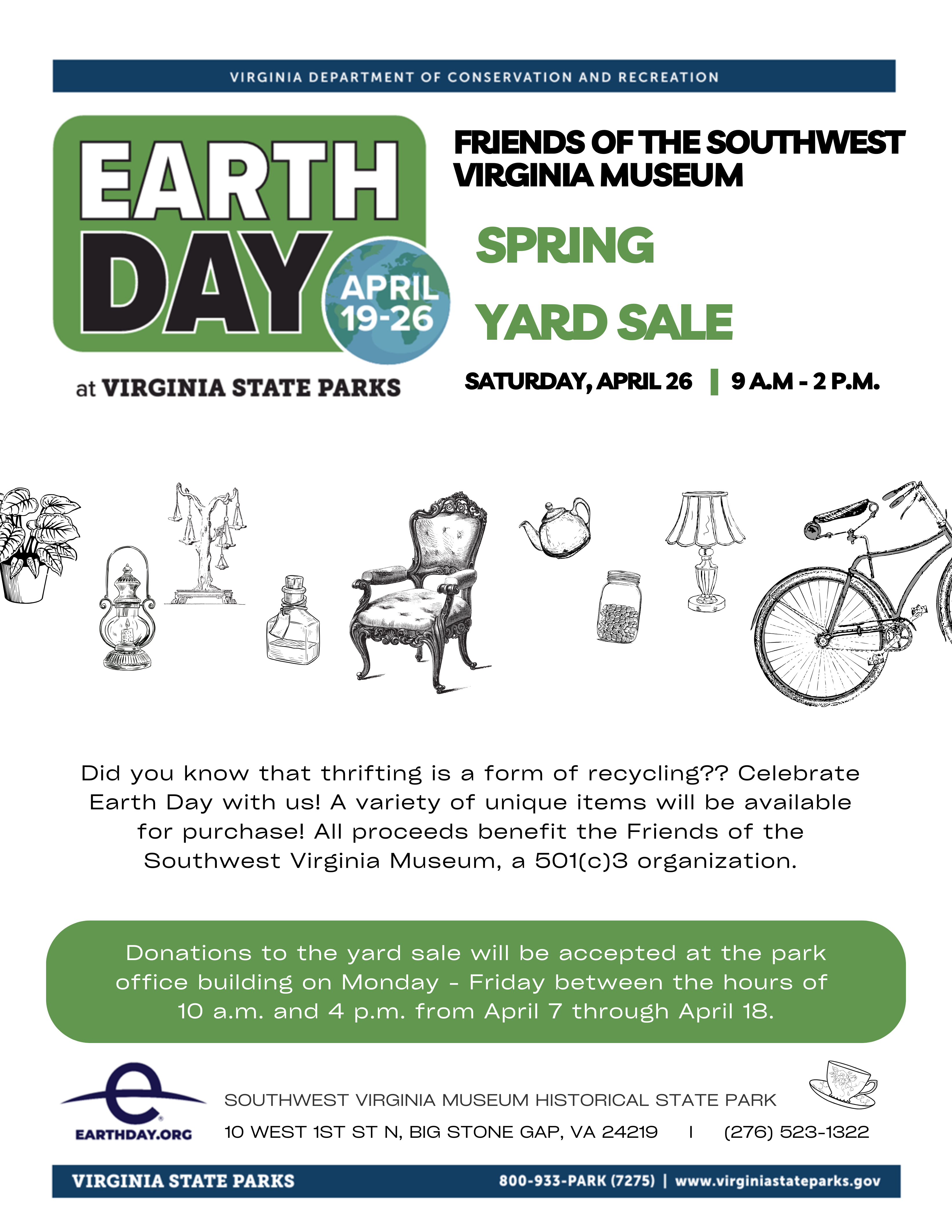 El Museo Friends of the Southwest Virginia organizará una venta de garaje del Día de la Tierra para recaudar fondos el sábado 26 de abril a partir de las 9 a.m. – 2 p.m. La venta de garaje ofrecerá una variedad de artículos para comprar, y todas las ganancias beneficiarán al Parque Estatal Histórico del Museo Friends of the Southwest Virginia.