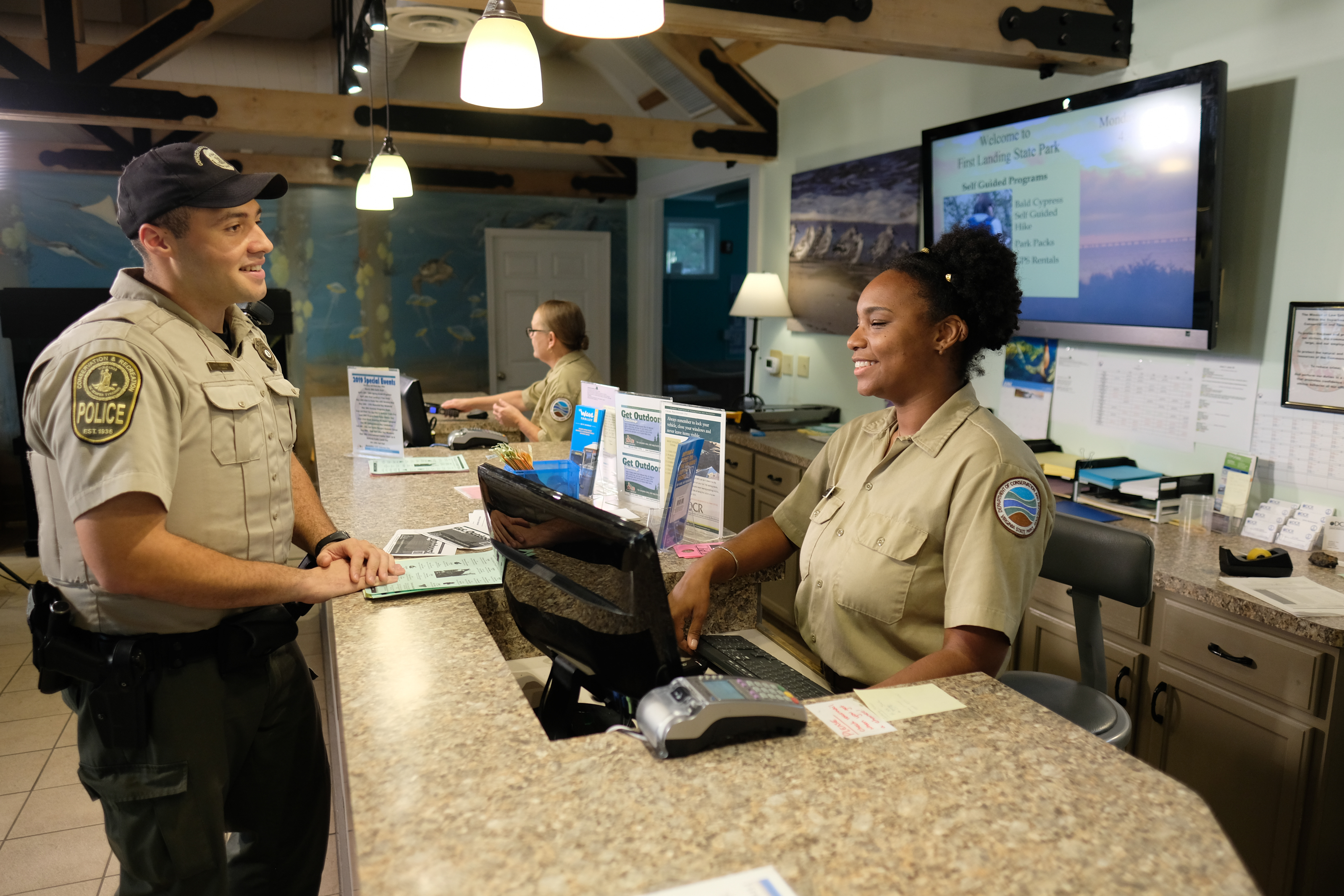 (Editores: Siga este enlace para descargar una imagen. Pie de foto: Trabajos de Servicio al Cliente y Guardaparques en el Parque Estatal First Landing)