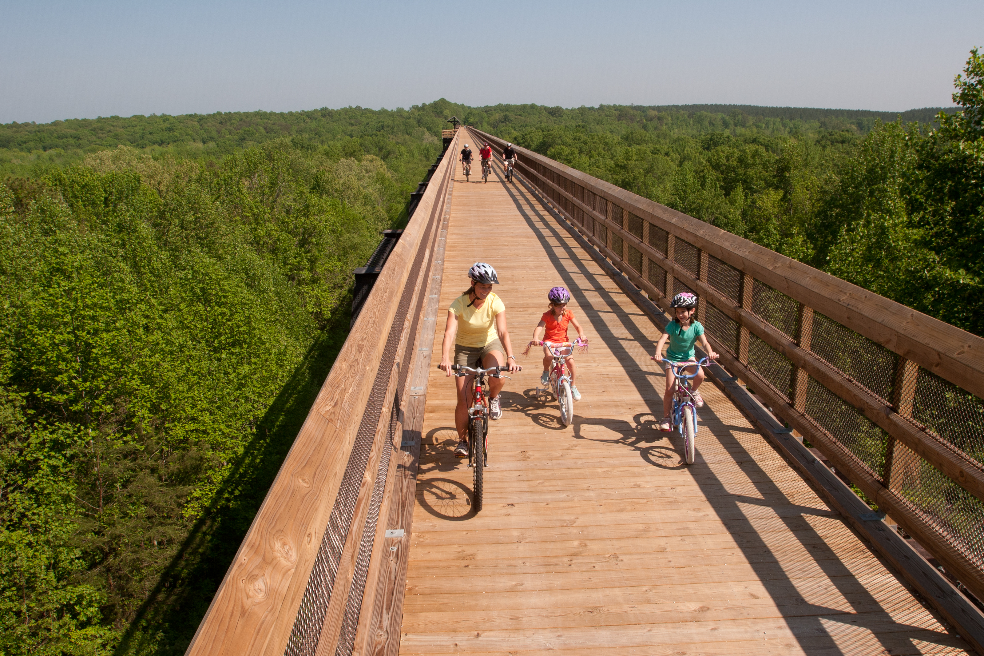 (Editores: Sigan este enlace para descargar una imagen. Pie de foto: Niños montando en bicicleta en el Parque Estatal High Bridge. Cortesía de Parques Estatales de Virginia)