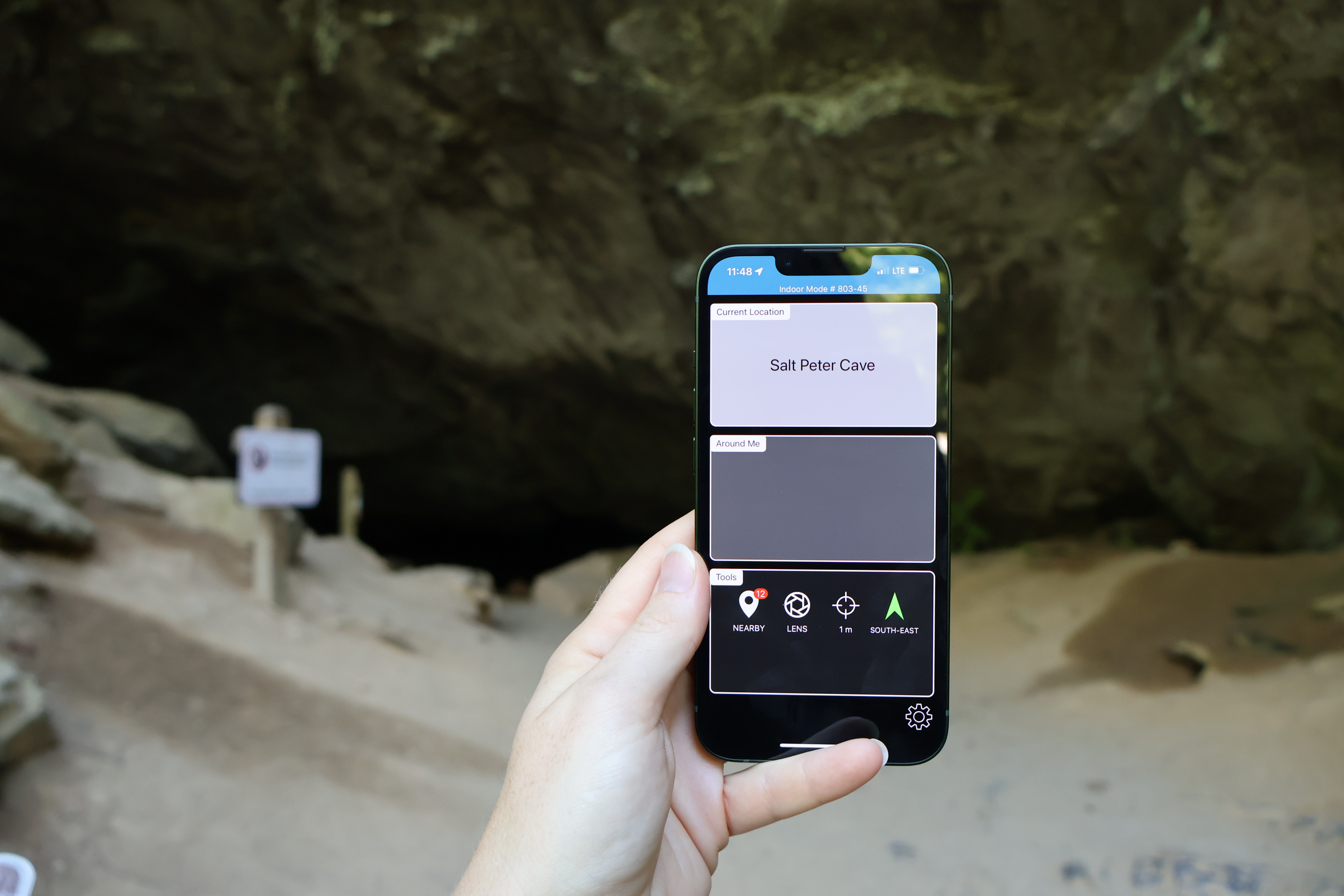 (Editores: Sigan este enlace para descargar una imagen. Pie de foto: Uso de la aplicación RightHear para navegar por el Parque Estatal Natural Bridge)