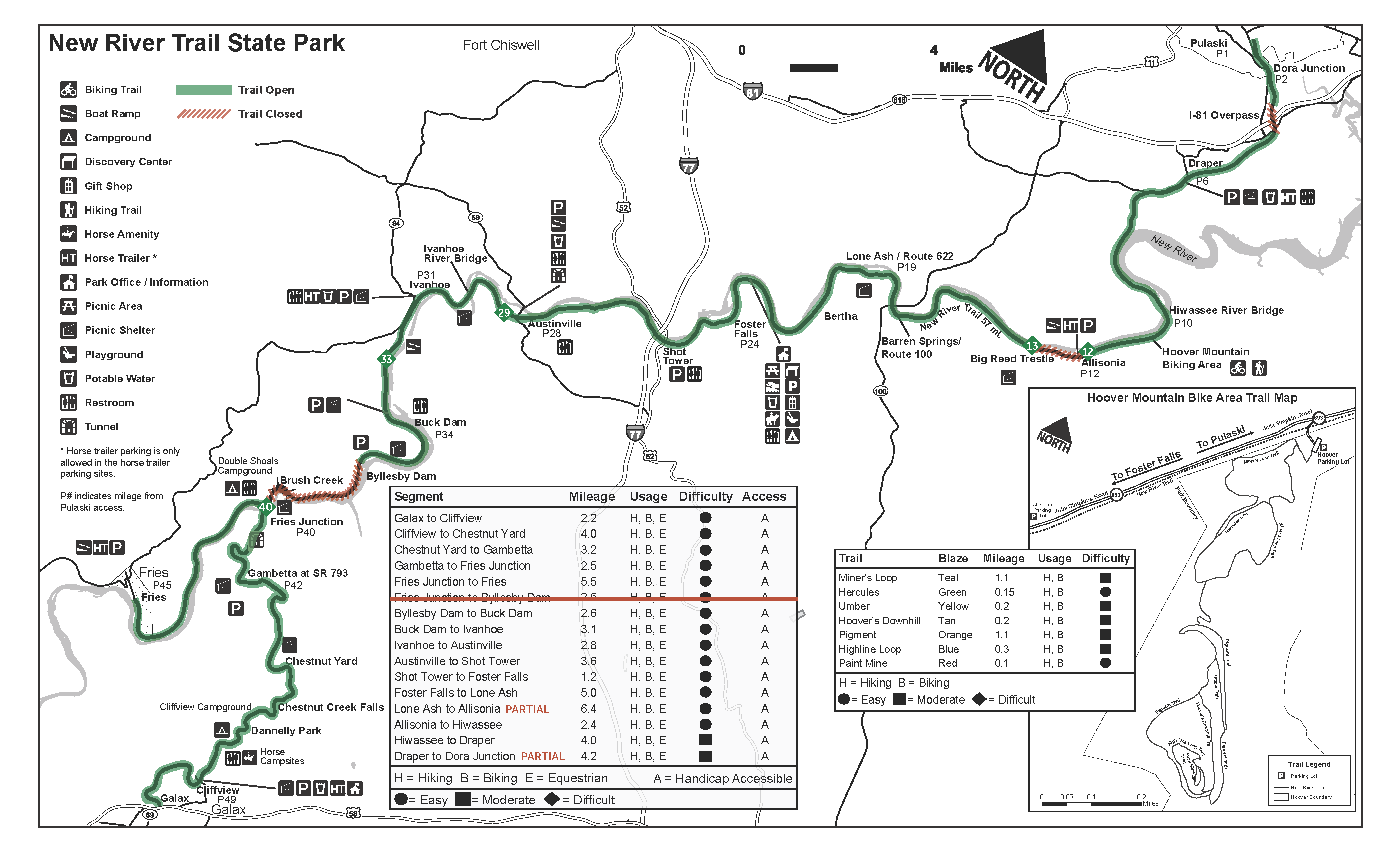 Para obtener más información y actualizaciones sobre las condiciones de los senderos, visite virginiastateparks.gov/new-river-trail o llame al 276-699-6778.