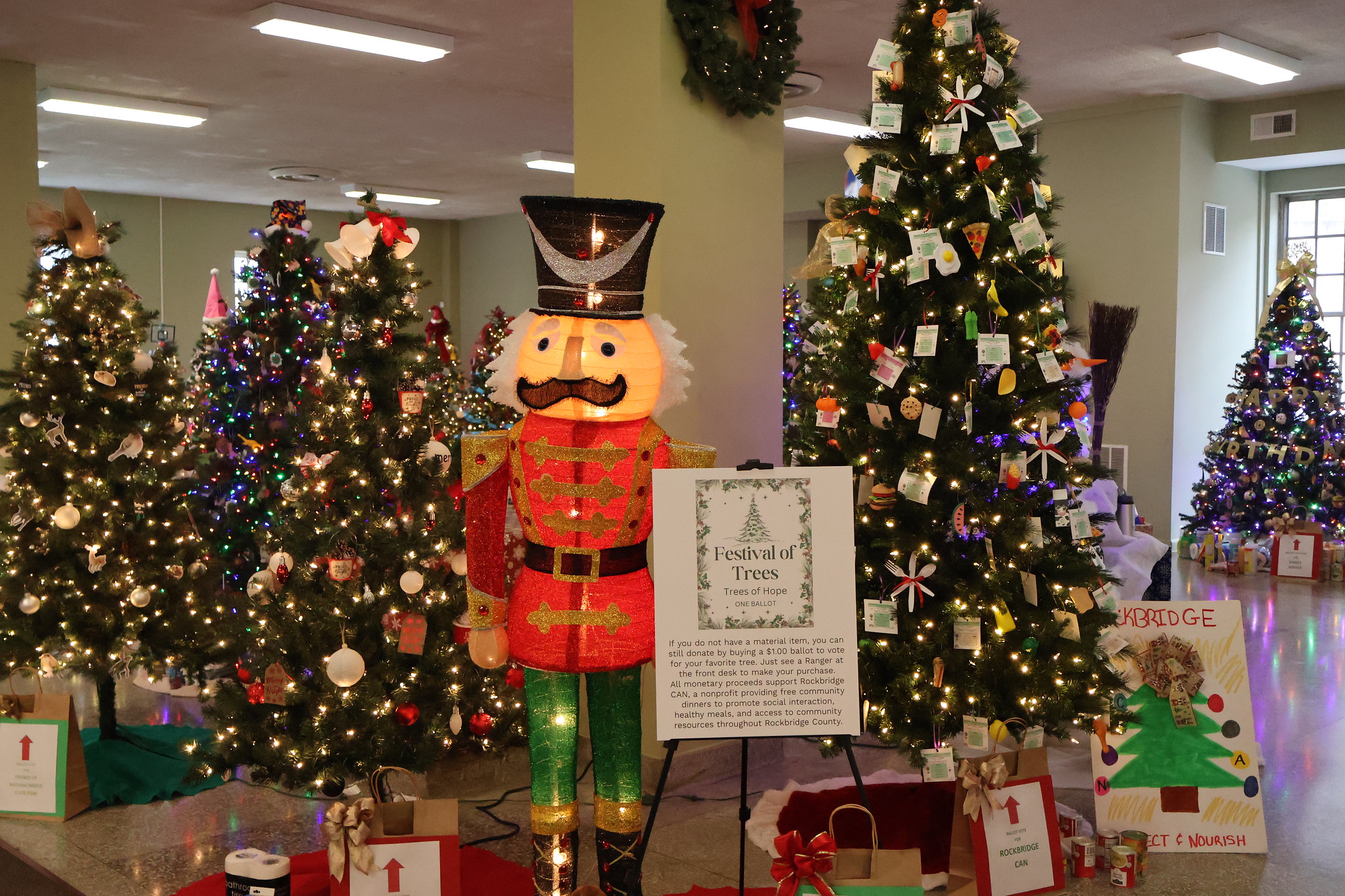 During the Festival of Trees, celebrating its 10th year, the visitor center will be filled with creatively decorated trees, each sponsored by local businesses and community groups. Visitors can vote for their favorite tree by placing donation items under it or purchasing a ballot from the front counter. The tree with the most ballots and donations by Dec. 31 will be named the winner.