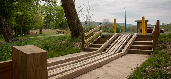 9 millas de senderos para caminatas / ciclismo. Poco más de dos millas de sendero se encuentran a lo largo de las "siete curvas" de la bifurcación norte del río Shenandoah. El resto de los senderos te llevan por la ladera occidental de la montaña Powell, que forma parte de la cordillera de Massanutten. El sendero Talus conecta a los visitantes con el sendero Massanutten en el Bosque Nacional George Washington-Jefferson.