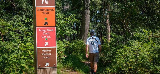 Actualmente hay dos rutas de senderismo de 1millas de largo en Widewater: Long Pond Trail y Holly Marsh Trail. Cerca del Centro de Visitantes se encuentra Long Pond Trail, que hace un amplio circuito alrededor del Centro de Visitantes y recorre secciones de Aquia Creek y Long Pond. Holly Marsh Trail se conecta con Long Pond Trail, proporcionando acceso al área de picnic de Potomac y bordea Holly Marsh. Al final / comienzo, esta caminata boscosa ofrece una vista impresionante del río Potomac. Ambos senderos están clasificados como fáciles y son solo para caminatas. Actualmente hay otros senderos en desarrollo en el parque, pero el senderismo por ellos está estrictamente prohibido mientras se lleva a cabo la construcción.